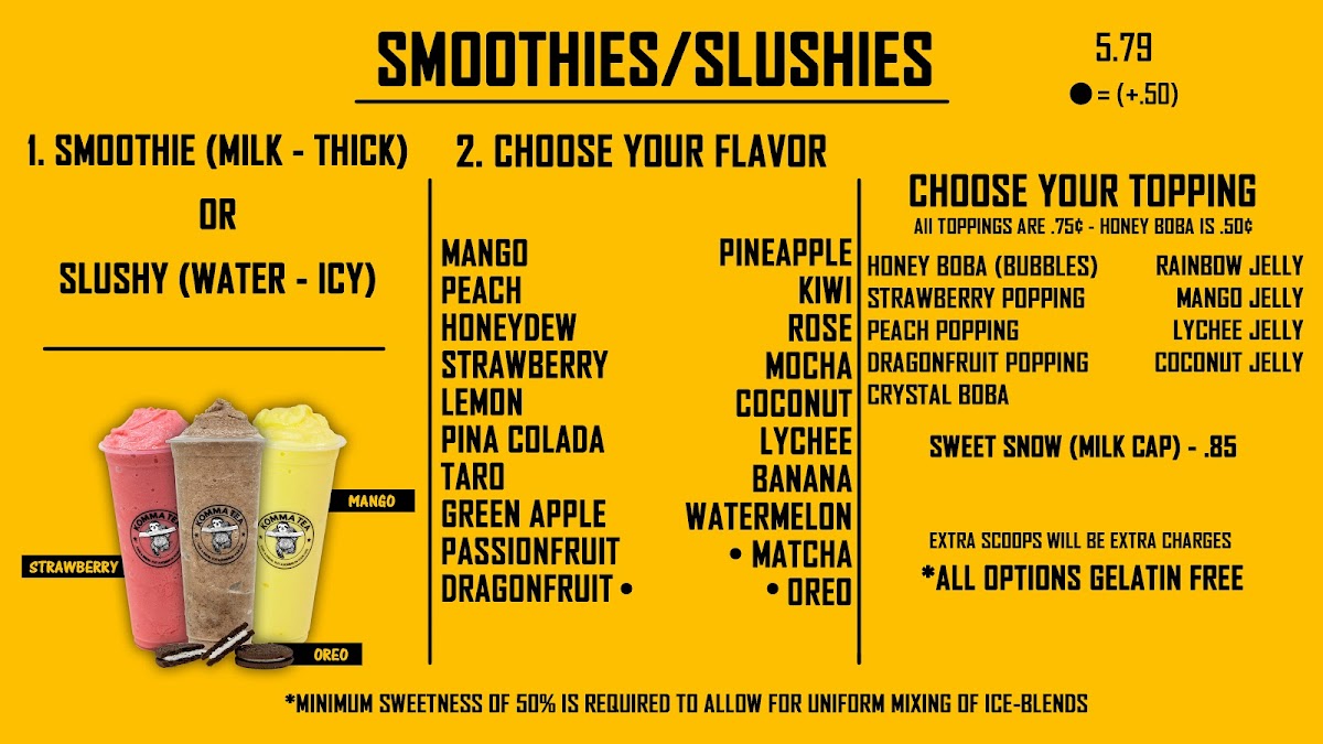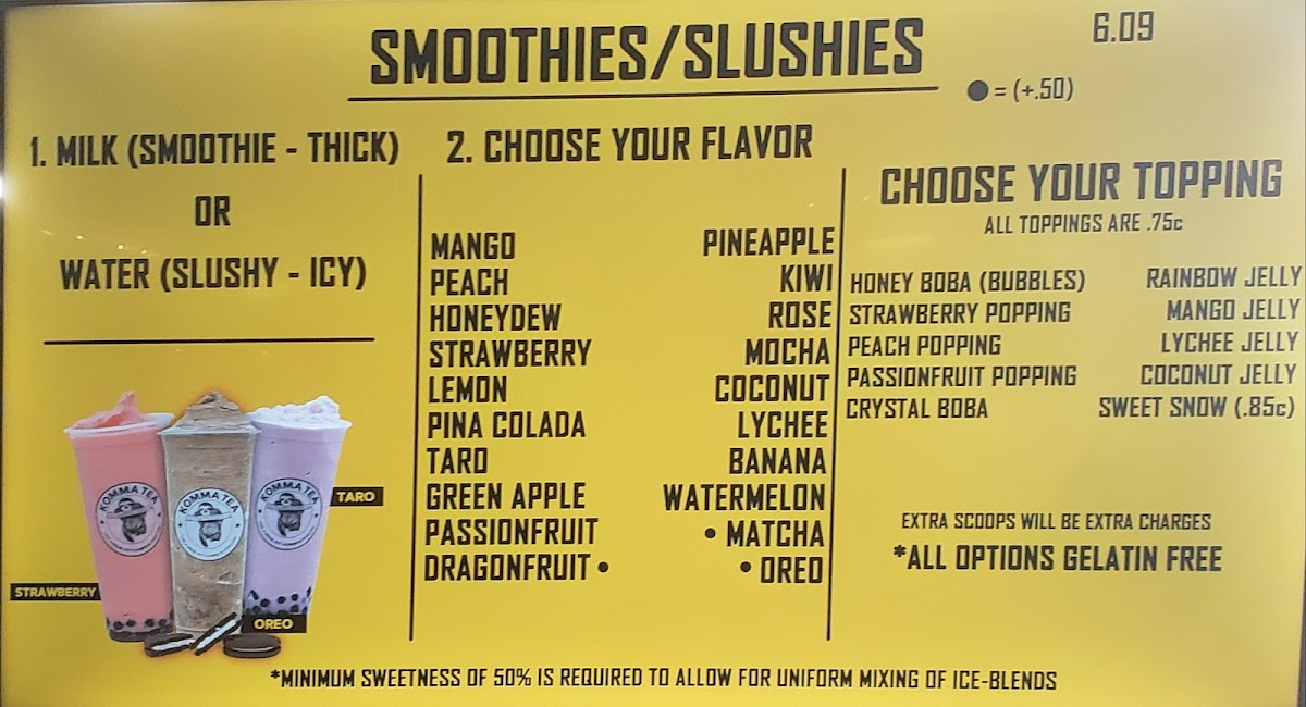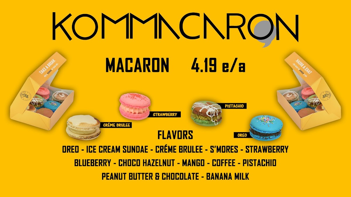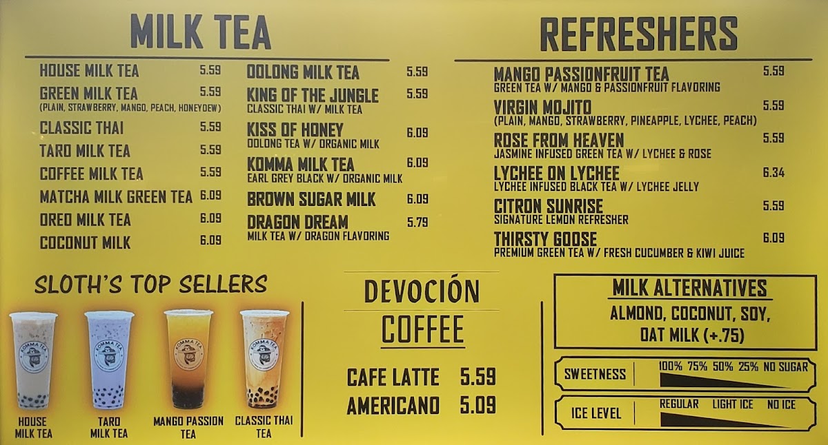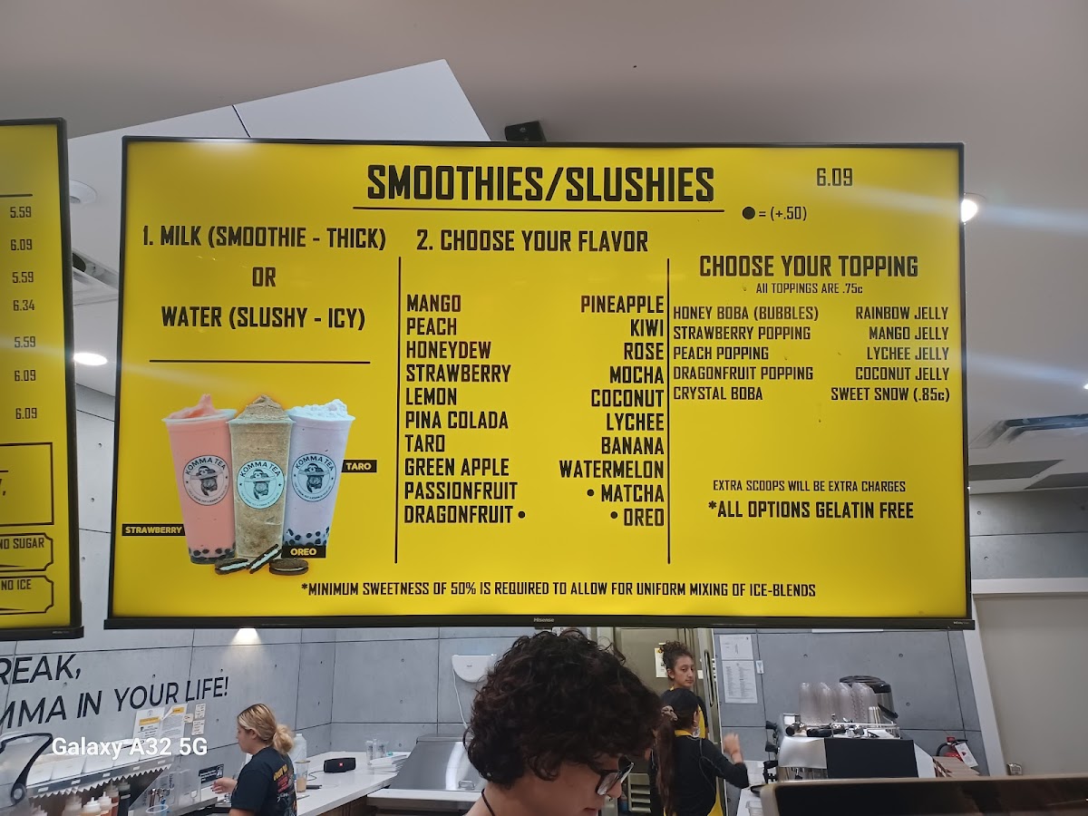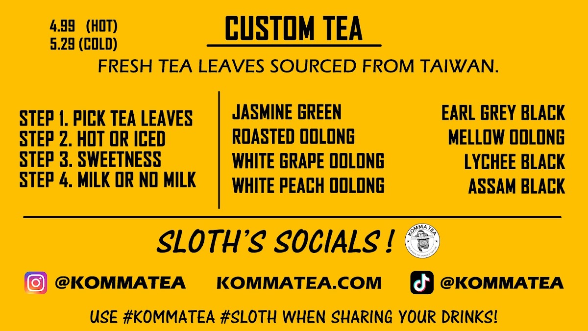 From a reviewer’s perspective, the menu at Komma Tea - Sawgrass offers a diverse and creative selection that caters to both classic tea lovers and those looking for something more unique. The milk tea lineup features popular choices like King Of The Jungle, House Milk Tea, Oolong Milk Tea HORCHATA, and Komma Milk Tea, providing a strong foundation for traditional boba fans. The bottled drink options such as Red Bull, Coconut Water, Water Cup With Ice Fiji Water, and S. Pellegrino are convenient additions for those who want something simple and refreshing. Coffee lovers can enjoy staples like Iced Cafe Latte, Double Espresso, Hot Americano, Hot Cafe Latte, and Iced Americano, while the refresher menu stands out with fruity and vibrant options like Mango Passion Tea, Red Ruby, Virgin Mojito Lychee On Lychee, and Thirsty Goose. For something thicker and sweeter, the smoothie and slush selections including Coconut, Mango Passion, Honeydew Lemon, and Matcha are appealing choices. The dessert side is nicely complemented by macaron flavors such as Creme Brulee M, Mango M, Oreo M, Peanut Butter M, and Choco Hazelnut M. Finally, tea enthusiasts can explore more traditional flavors through the custom tea section with Iced Genmaicha Green, Hot Mellow Oolong, Hot Grape Oolong, Iced Roasted Oolong, and Hot Peach Oolong, making the menu feel well-rounded and thoughtfully curated. Overall, the menu provides a balanced mix of milk teas, fruit teas, coffee, smoothies, and desserts, making it a versatile spot for a wide range of tastes.